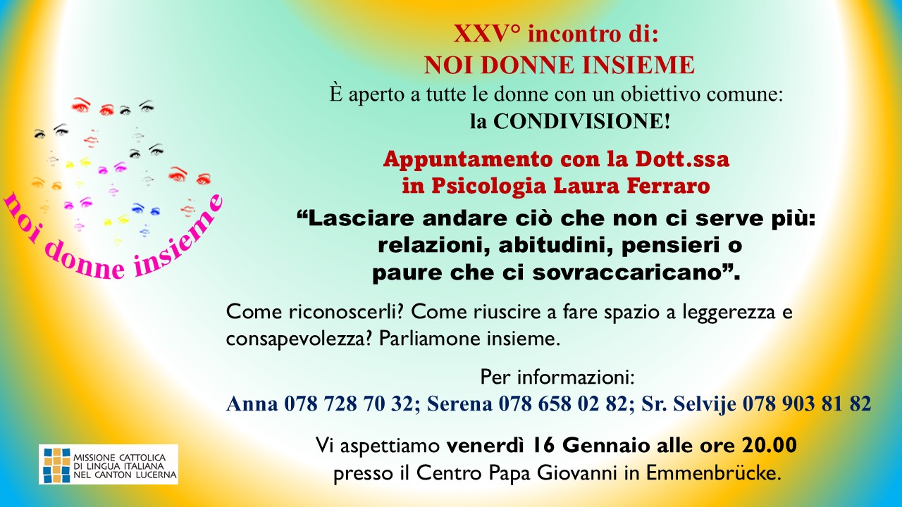 Incontro di "noi donne insieme", venerdì 16 gennaio 2026